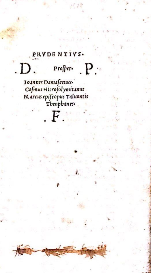 Prudentius. Prosper. Ioannes Damascenus. Cosmus Hierosolymitanus Marcus episcopus Taluontis Theophanes. [Lyon]:[Barthélemy Trot?], [1502/1503], 8°. Canterbury Cathedral Library W2/X-3-34, with previous owner’s initials ‘D. P. F.’ and another illegible ownership inscription.